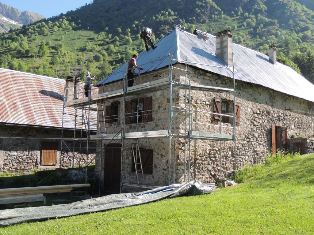 Rénovation charpente en sapin de pays non traitéRemplacement de la couverture en tôle onduléeZinguerie